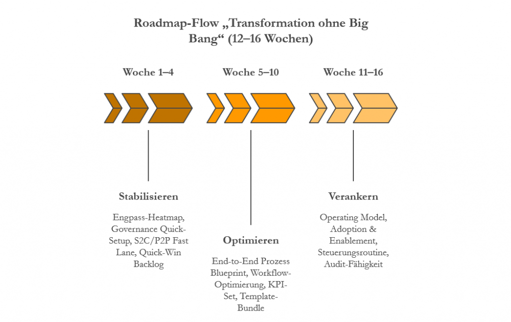 - Transformation Blueprint (12–16 Wochen Plan): priorisierte Roadmap, Maßnahmenlogik, Abhängigkeiten, Ressourcenmodell.