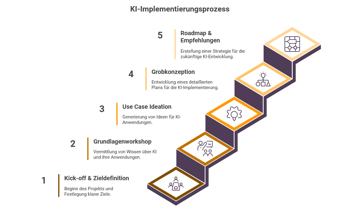 Ein Enablement-Programm, das Teams mitnimmt: Ziele klären, KI verständlich machen, Use Cases priorisieren, Prototypen bauen und eine umsetzbare Roadmap verabschieden.