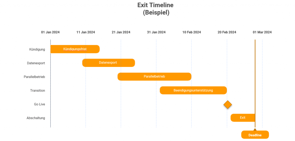 - Exit-Playbook: Portabilität, Transition-Leistungen, Unterstützungspflichten, Kostenlogik, Zeitplan, Verantwortlichkeiten